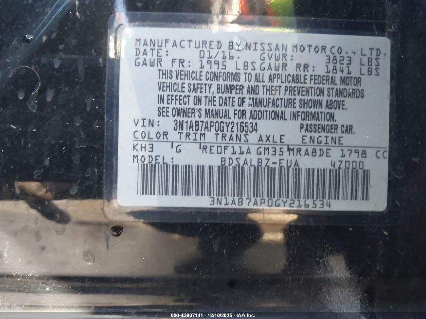 2016 NISSAN SENTRA - 3N1AB7AP0GY216534, колір - Чорний, 1.8, Бензин, Передній привід із США