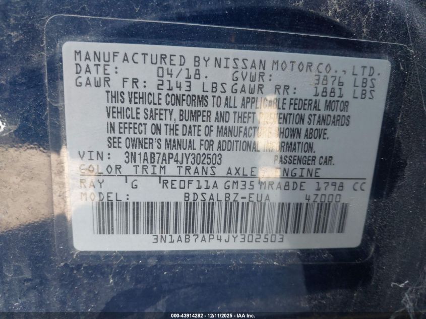 2018 NISSAN SENTRA - 3N1AB7AP4JY302503, колір - Синій, 1.8, Бензин, Передній привід із США