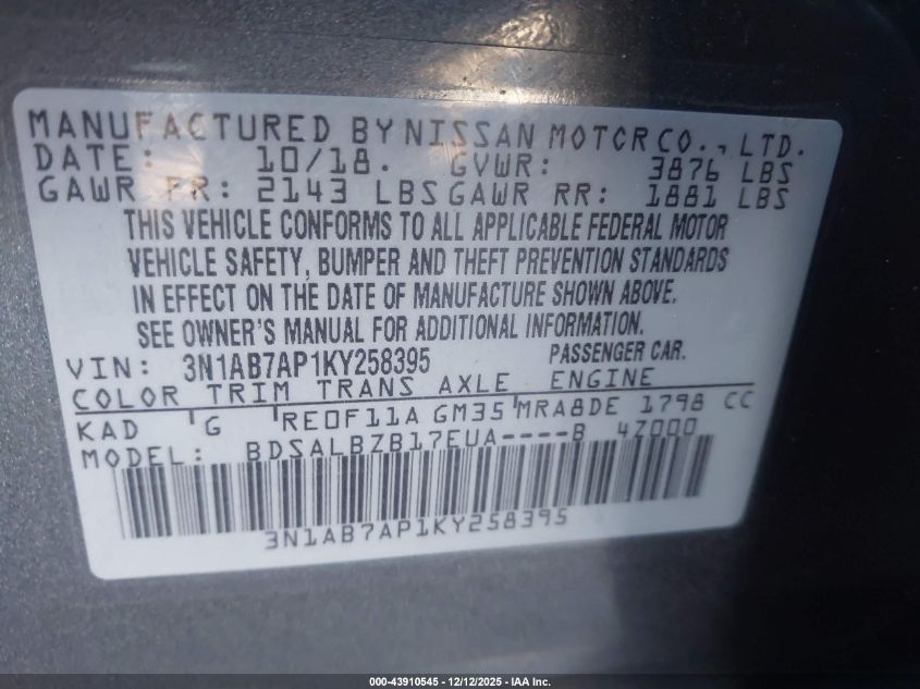 2019 NISSAN SENTRA - 3N1AB7AP1KY258395, колір - Сірий, 1.8, Бензин, Передній привід із США