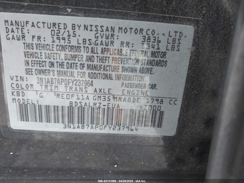 Колір СірийЦиліндри 4Привід Передній привідVIN 3N1AB7AP0FY237964Стан Заводиться та їде (перевірено)Ушкодження Права сторонаДата аукціона 2025-11-17