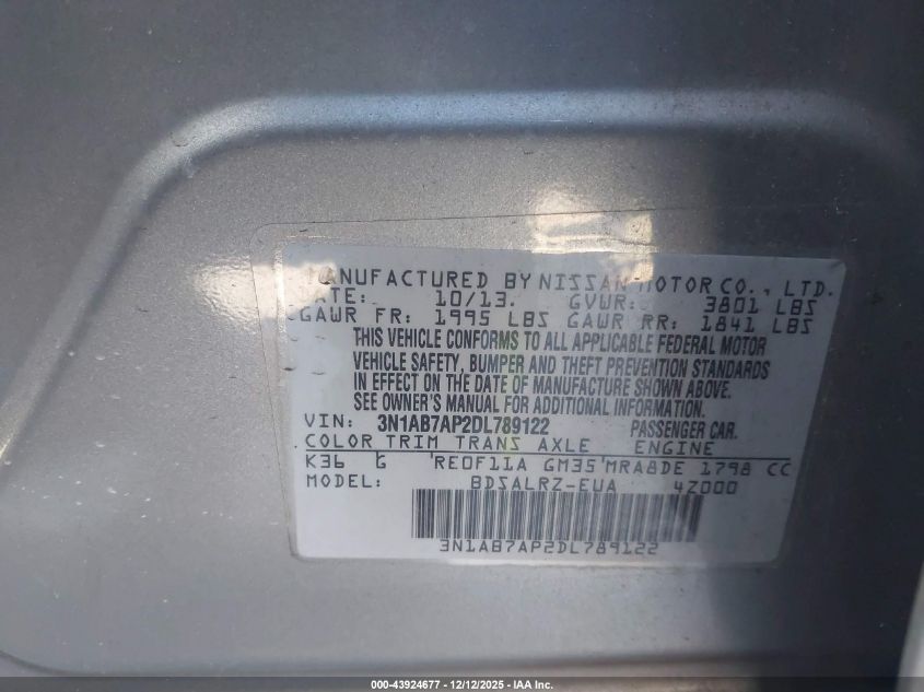 Колір СрібнийЦиліндри 4Привід Передній привідVIN 3N1AB7AP2DL789122Стан Заводиться та їде (перевірено)Ушкодження Задня