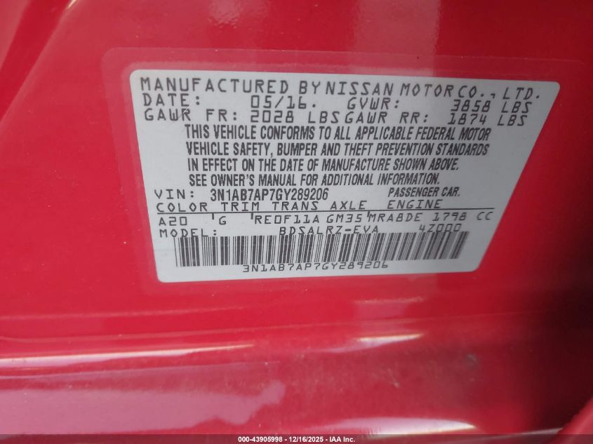 2016 NISSAN SENTRA - 3N1AB7AP7GY289206, колір - Червоний, 1.8, Бензин, Передній привід із США