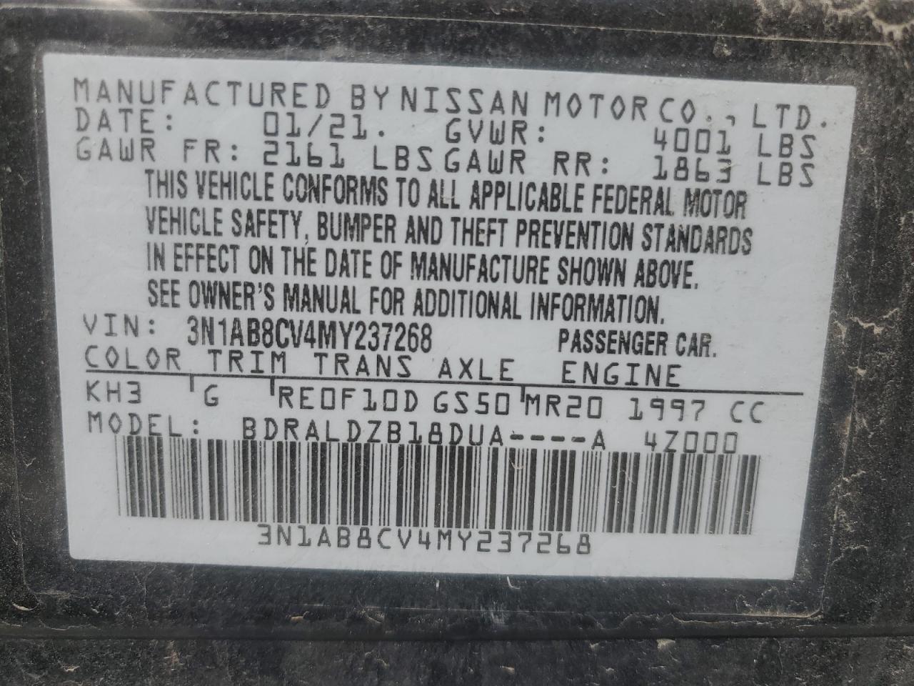 2021 NISSAN SENTRA - 3N1AB8CV4MY237268, колір - Чорний, 2.0, Бензин, із США