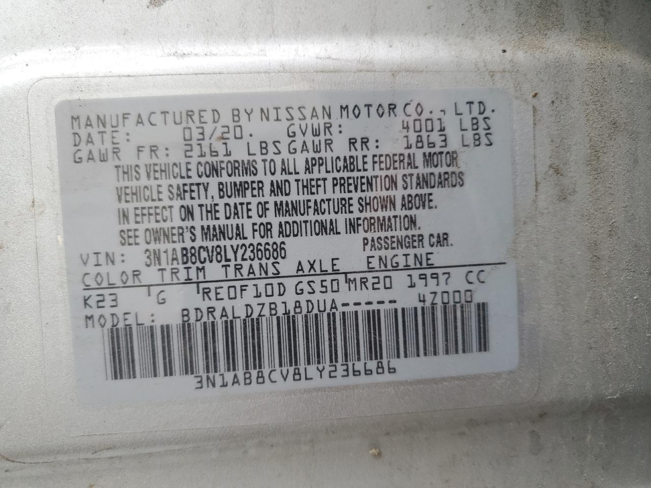 2020 NISSAN SENTRA - 3N1AB8CV8LY236686, колір - Срібний, 2.0, Бензин, із США