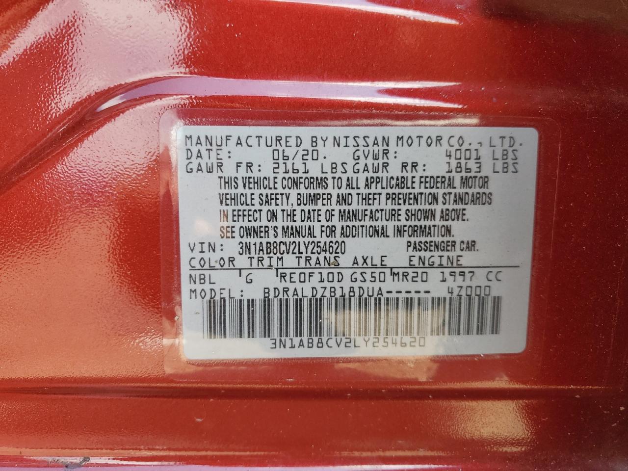 2020 NISSAN SENTRA - 3N1AB8CV2LY254620, колір - Червоний, 2.0, Бензин, із США