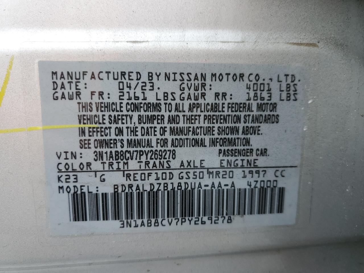 2023 NISSAN SENTRA - 3N1AB8CV7PY269278, колір - Срібний, 2.0, Бензин, із США