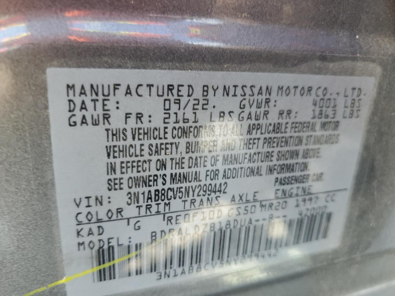 2022 NISSAN SENTRA - 3N1AB8CV5NY299442, колір - Сірий, 2.0, Бензин, із США