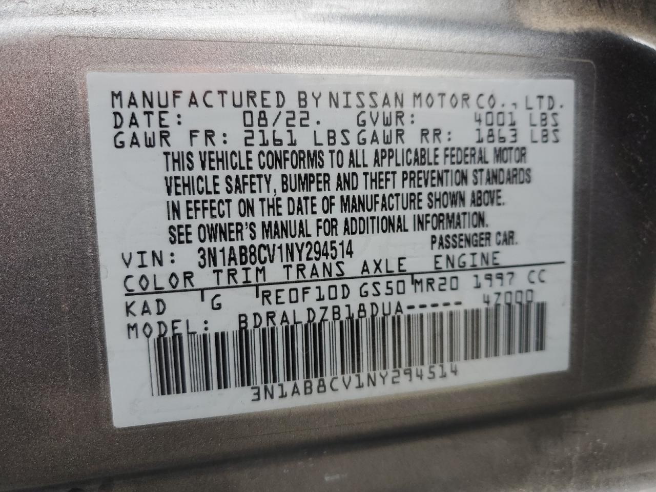 2022 NISSAN SENTRA - 3N1AB8CV1NY294514, колір - Сірий, 2.0, Бензин, із США