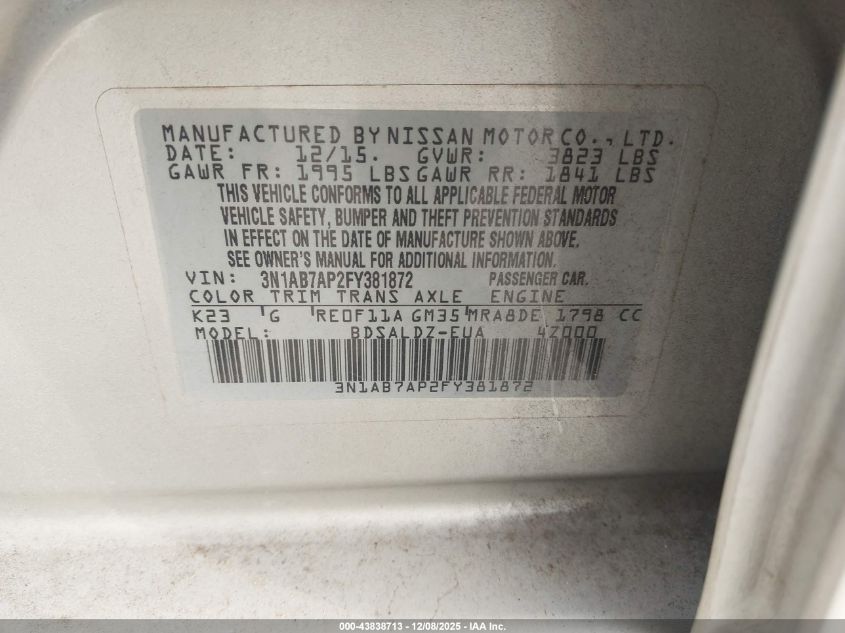 Колір СрібнийЦиліндри 4Привід Передній привідVIN 3N1AB7AP2FY381872Стан Заводиться та їде (перевірено)Ушкодження Передня ліва