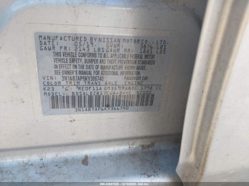 2019 NISSAN SENTRA - 3N1AB7AP6KY366740, колір - Срібний, 1.8, Бензин, Передній привід із США