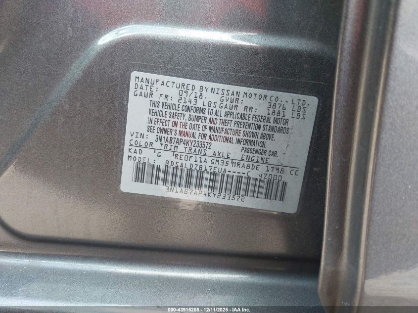 2019 NISSAN SENTRA - 3N1AB7AP4KY233572, колір - Чорний, 1.8, Бензин, Передній привід із США