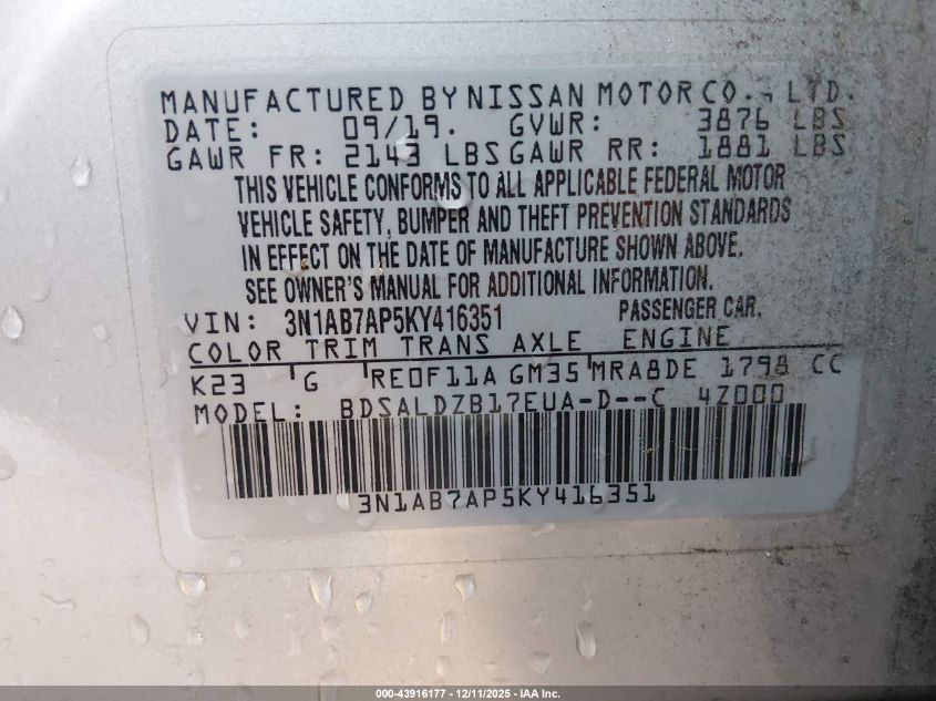 2019 NISSAN SENTRA - 3N1AB7AP5KY416351, колір - Срібний, 1.8, Бензин, Передній привід із США