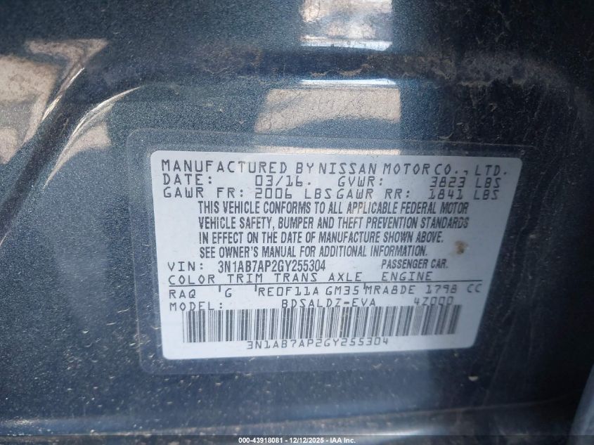 2016 NISSAN SENTRA - 3N1AB7AP2GY255304, колір - Мілітарі, 1.8, Бензин, Передній привід із США