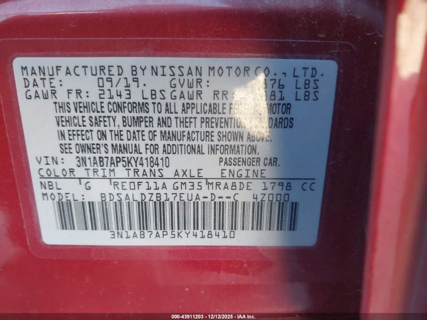 2019 NISSAN SENTRA - 3N1AB7AP5KY418410, колір - Червоний, 1.8, Бензин, Передній привід із США