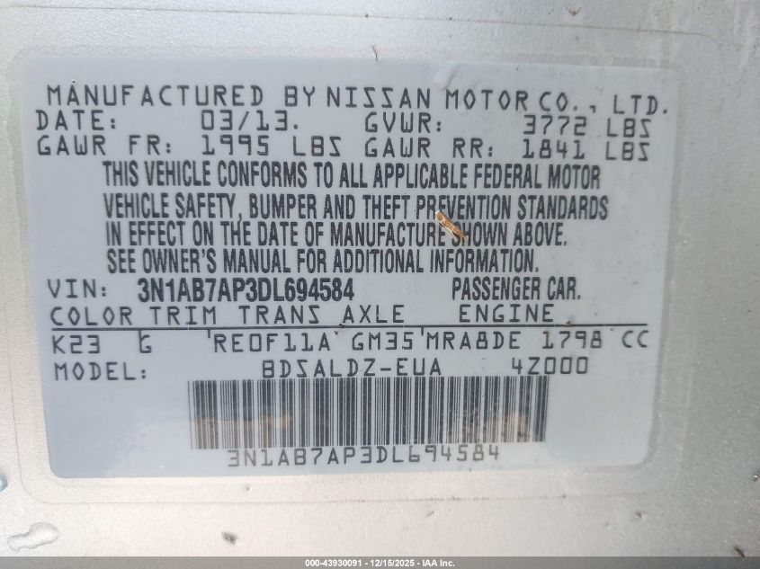 2013 NISSAN SENTRA - 3N1AB7AP3DL694584, колір - Срібний, 1.8, Бензин, Передній привід із США