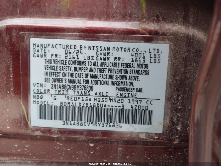 2024 NISSAN SENTRA - 3N1AB8CV9RY376836, колір - Бургундія, 2.0, Бензин, Передній привід із США