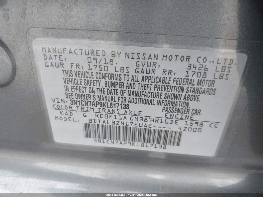 Колір СірийЦиліндри 4Привід Передній привідVIN 3N1CN7AP9KL817138Стан Заводиться та їде (перевірено)Ушкодження Права сторона