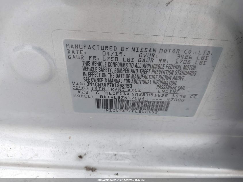 2019 NISSAN VERSA - 3N1CN7AP7KL868153, колір - Срібний, 1.6, Бензин, Передній привід із США