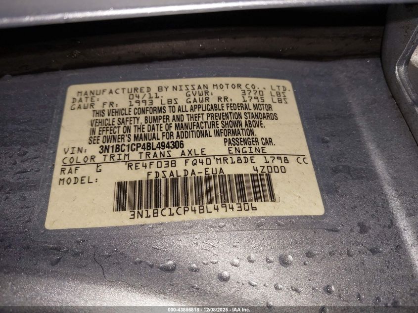 Колір СинійЦиліндри 4Привід Передній привідVIN 3N1BC1CP4BL494306Стан СтаціонарноУшкодження Передня або задня