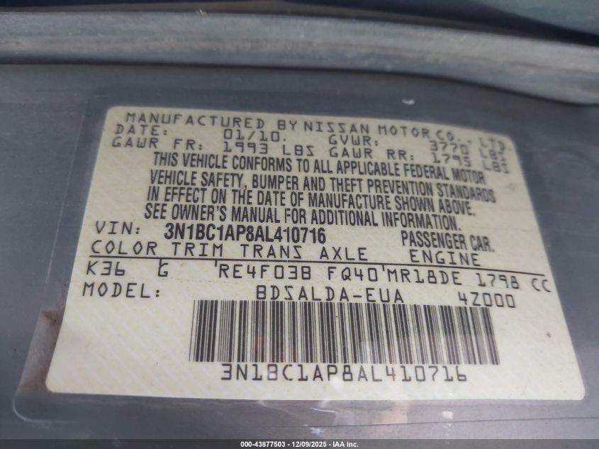 Колір СірийЦиліндри 4Привід Передній привідVIN 3N1BC1AP8AL410716Стан Заводиться та їде (перевірено)Ушкодження Права сторона