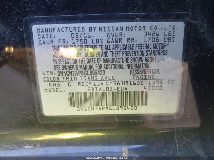 2016 NISSAN VERSA - 3N1CN7AP8GL895420, колір - Чорний, 1.6, Бензин, Передній привід із США