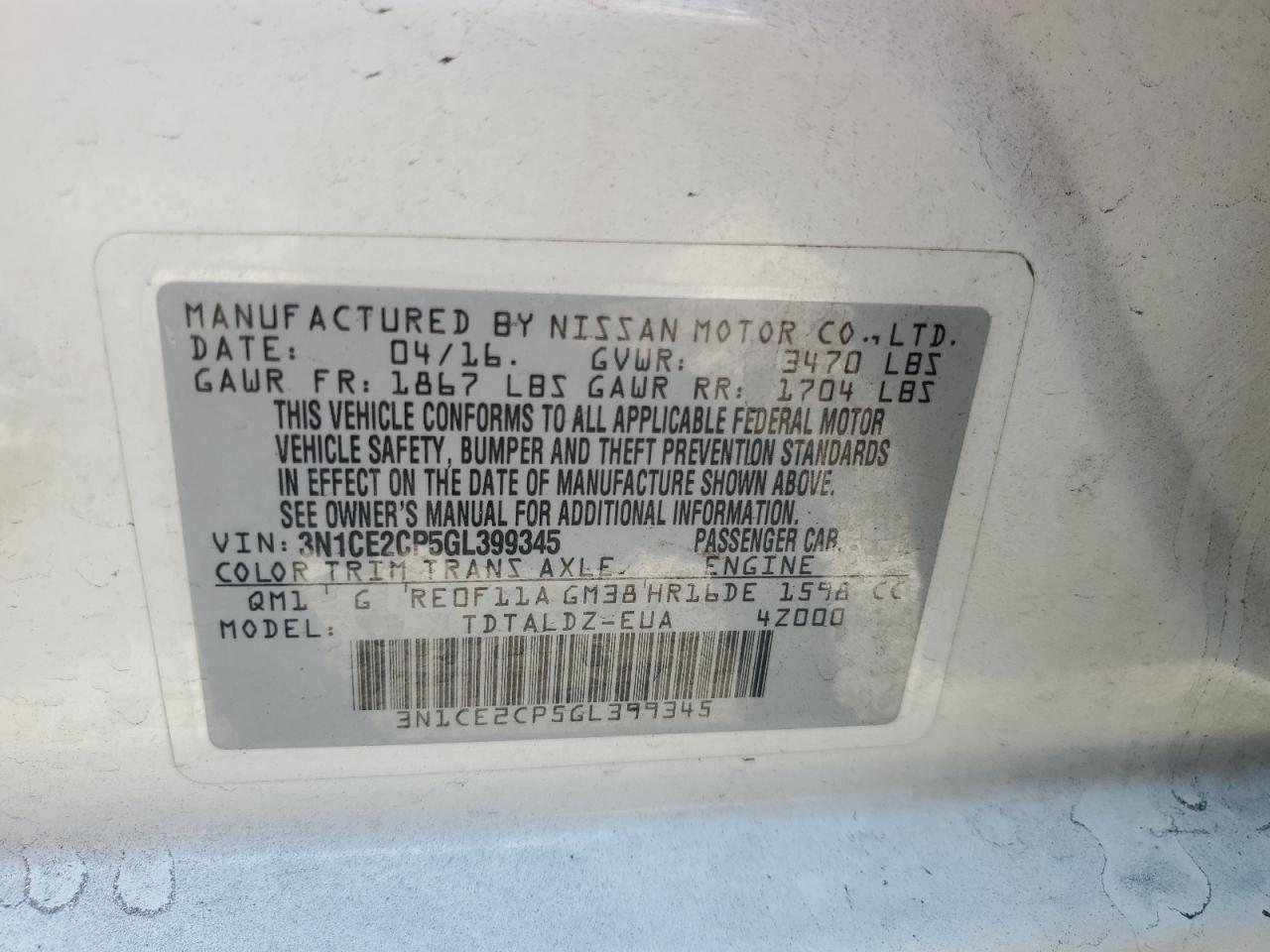 2016 NISSAN VERSA NOTE - 3N1CE2CP5GL399345, колір - Білий, 1.6, Бензин, із США