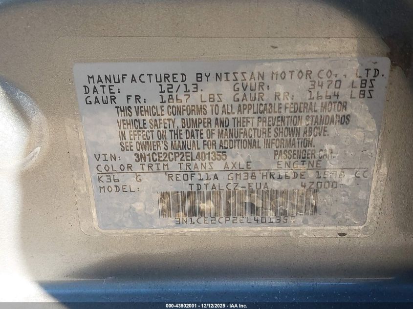 2014 NISSAN VERSA NOTE - 3N1CE2CP2EL401355, колір - Сірий, 1.6, Бензин, Передній привід із США