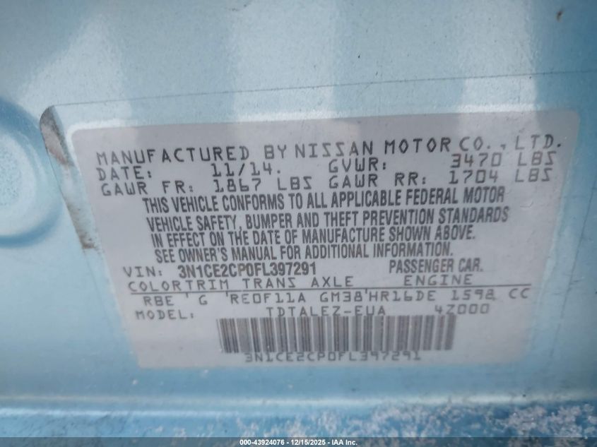 2015 NISSAN VERSA NOTE - 3N1CE2CP0FL397291, колір - Синій, 1.6, Бензин, Передній привід із США
