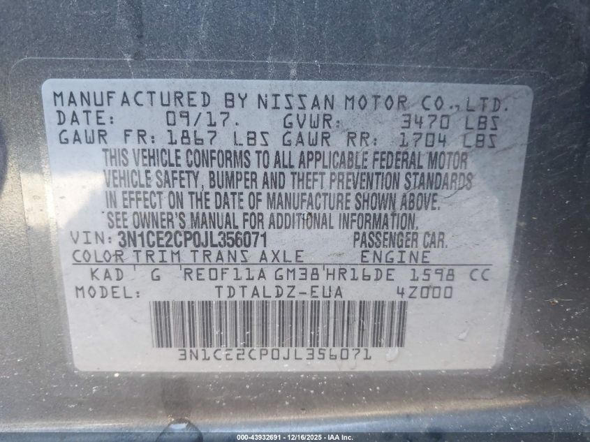 2018 NISSAN VERSA NOTE - 3N1CE2CP0JL356071, колір - , 1.6, Бензин, Передній привід із США
