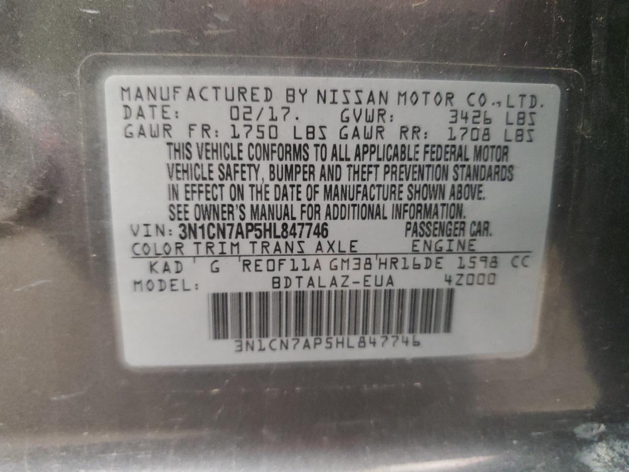 2017 NISSAN VERSA - 3N1CN7AP5HL847746, колір - Сірий, 1.6, Бензин, із США