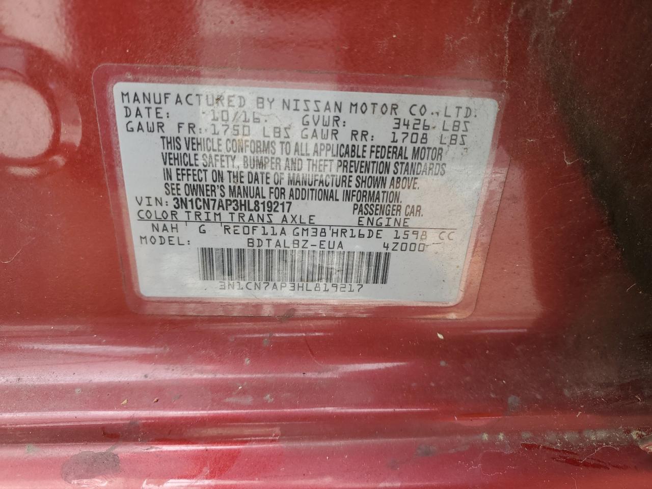 2017 NISSAN VERSA - 3N1CN7AP3HL819217, колір - Червоний, 1.6, Бензин, із США
