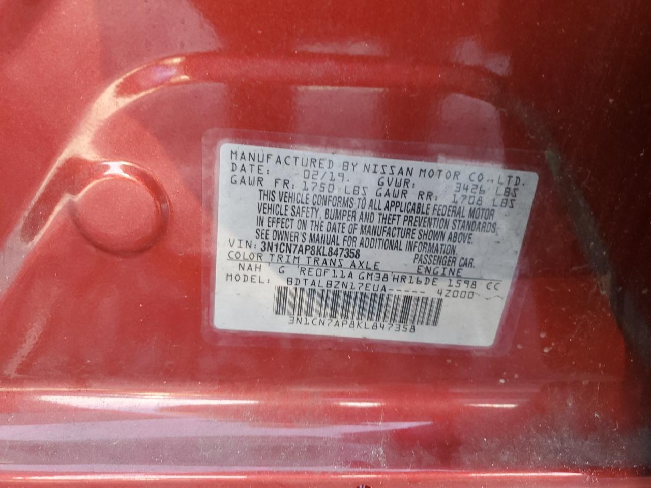 2019 NISSAN VERSA - 3N1CN7AP8KL847358, колір - Червоний, 1.6, Бензин, із США