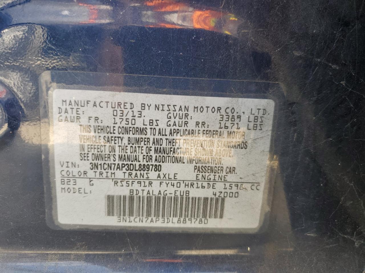 Колір СинійЦиліндри 4VIN 3N1CN7AP3DL889780Стан Заводиться та їде (перевірено)Ушкодження НезначніДата аукціона 2025-10-06