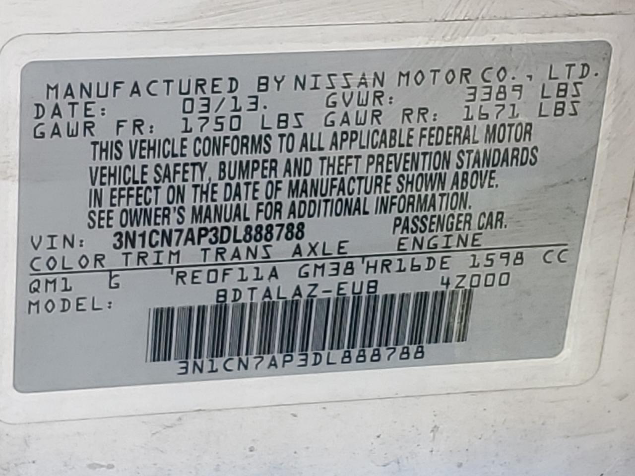 2013 NISSAN VERSA - 3N1CN7AP3DL888788, колір - Білий, 1.6, Бензин, із США