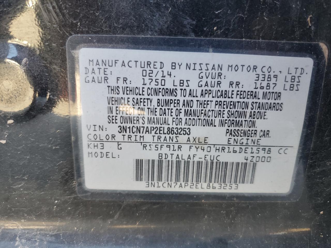 Колір ЧорнийЦиліндри 4VIN 3N1CN7AP2EL863253Стан ЗаводитьсяУшкодження НезначніДата аукціона 2025-10-09