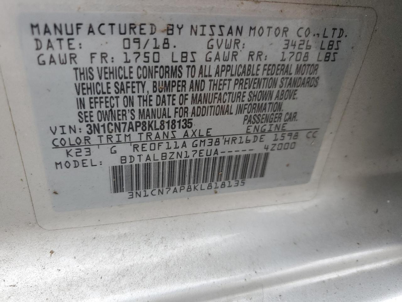 Колір СрібнийЦиліндри 4VIN 3N1CN7AP8KL818135Стан Заводиться та їде (перевірено)Ушкодження НезначніДата аукціона 2025-10-20