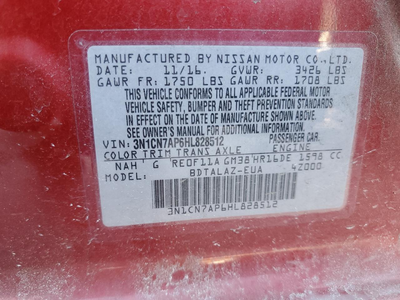 2017 NISSAN VERSA - 3N1CN7AP6HL828512, колір - Червоний, 1.6, Бензин, із США