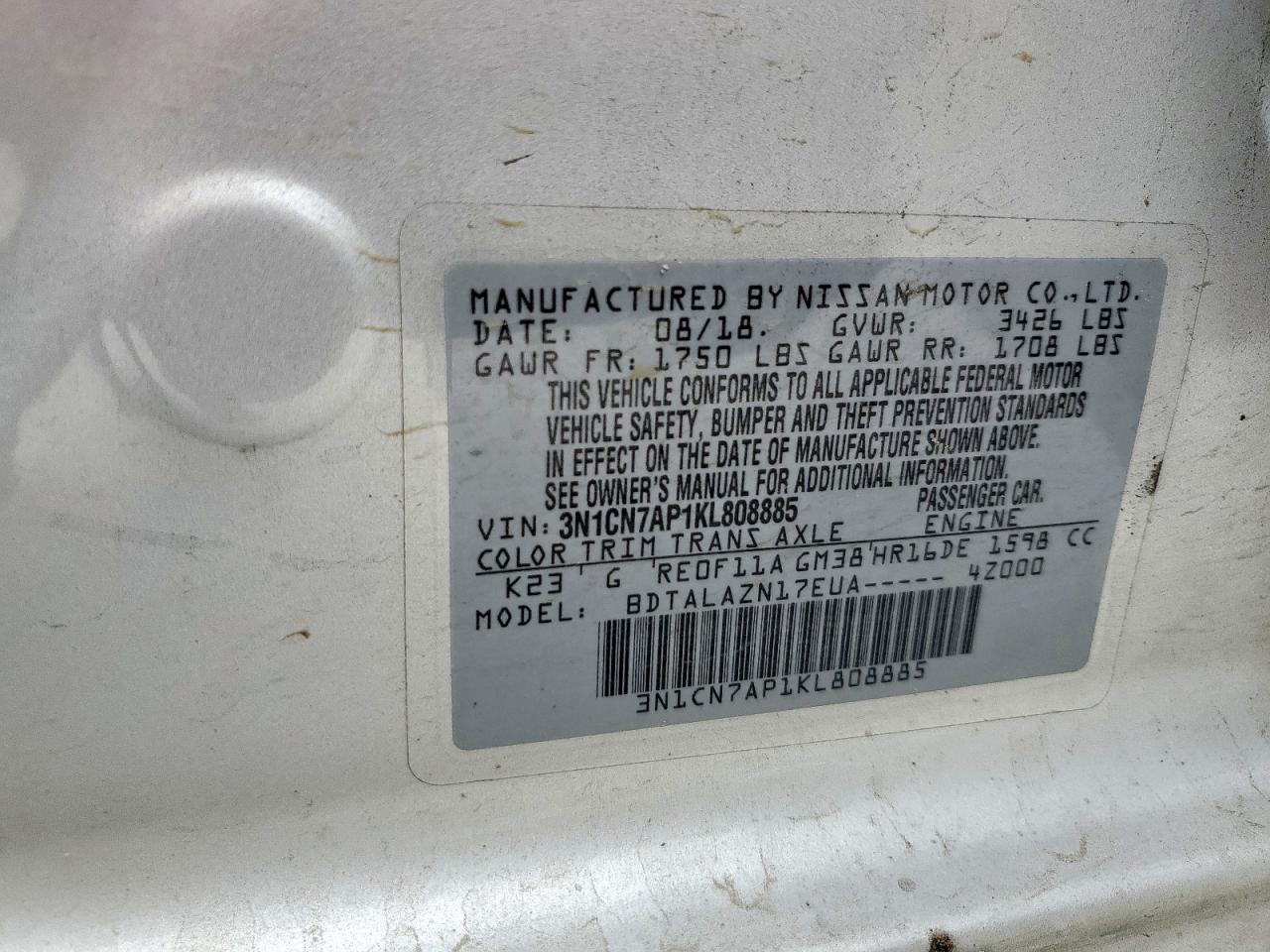 Колір СрібнийЦиліндри 4VIN 3N1CN7AP1KL808885Стан Заводиться та їде (перевірено)Ушкодження Передня або задня