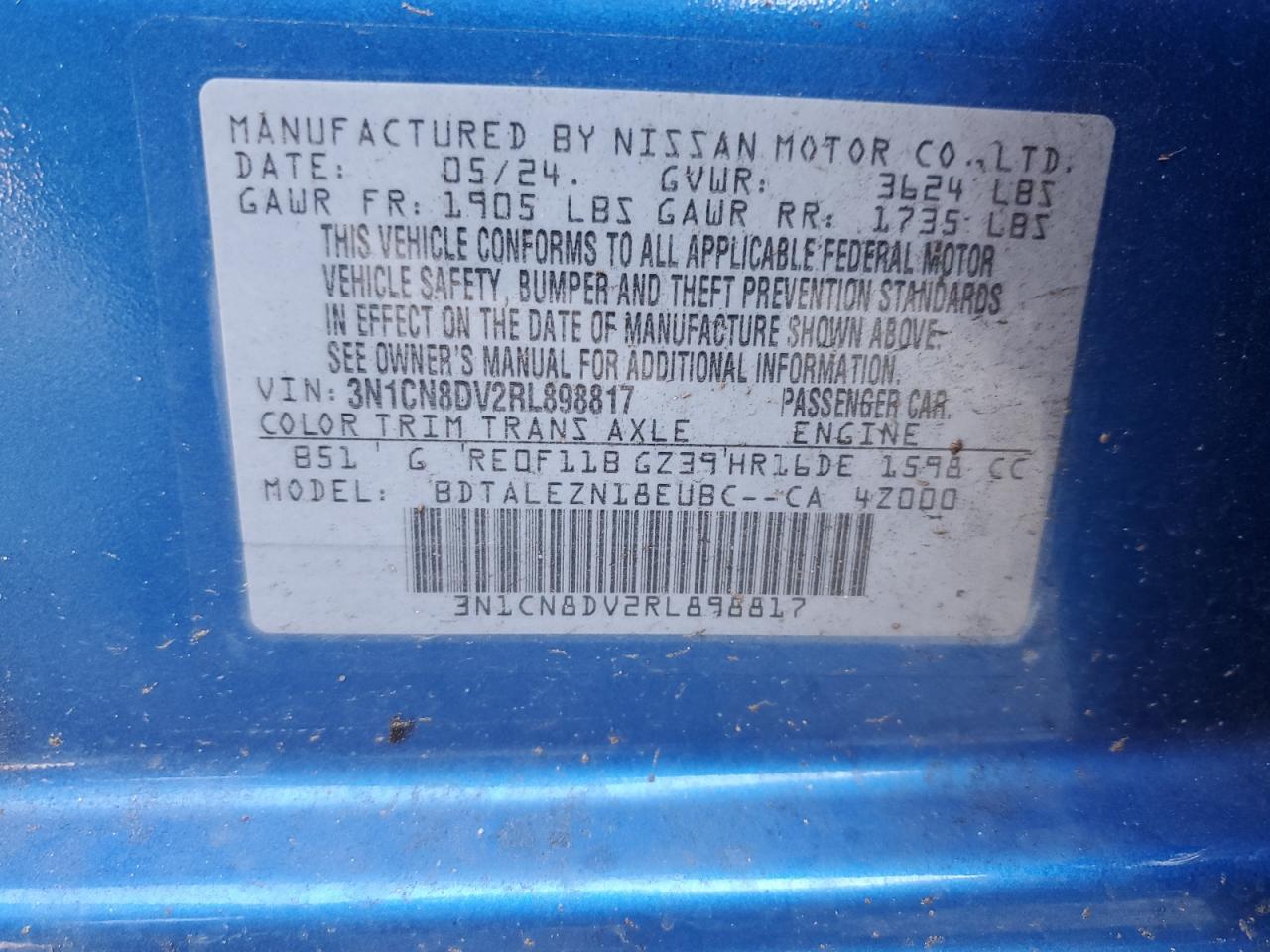 2024 NISSAN VERSA - 3N1CN8DV2RL898817, колір - Синій, 1.6, Бензин, із США