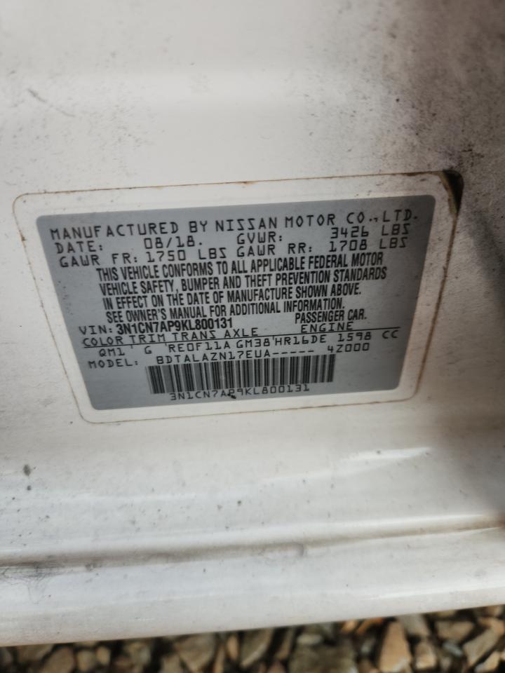 2019 NISSAN VERSA - 3N1CN7AP9KL800131, колір - Білий, 1.6, Бензин, із США