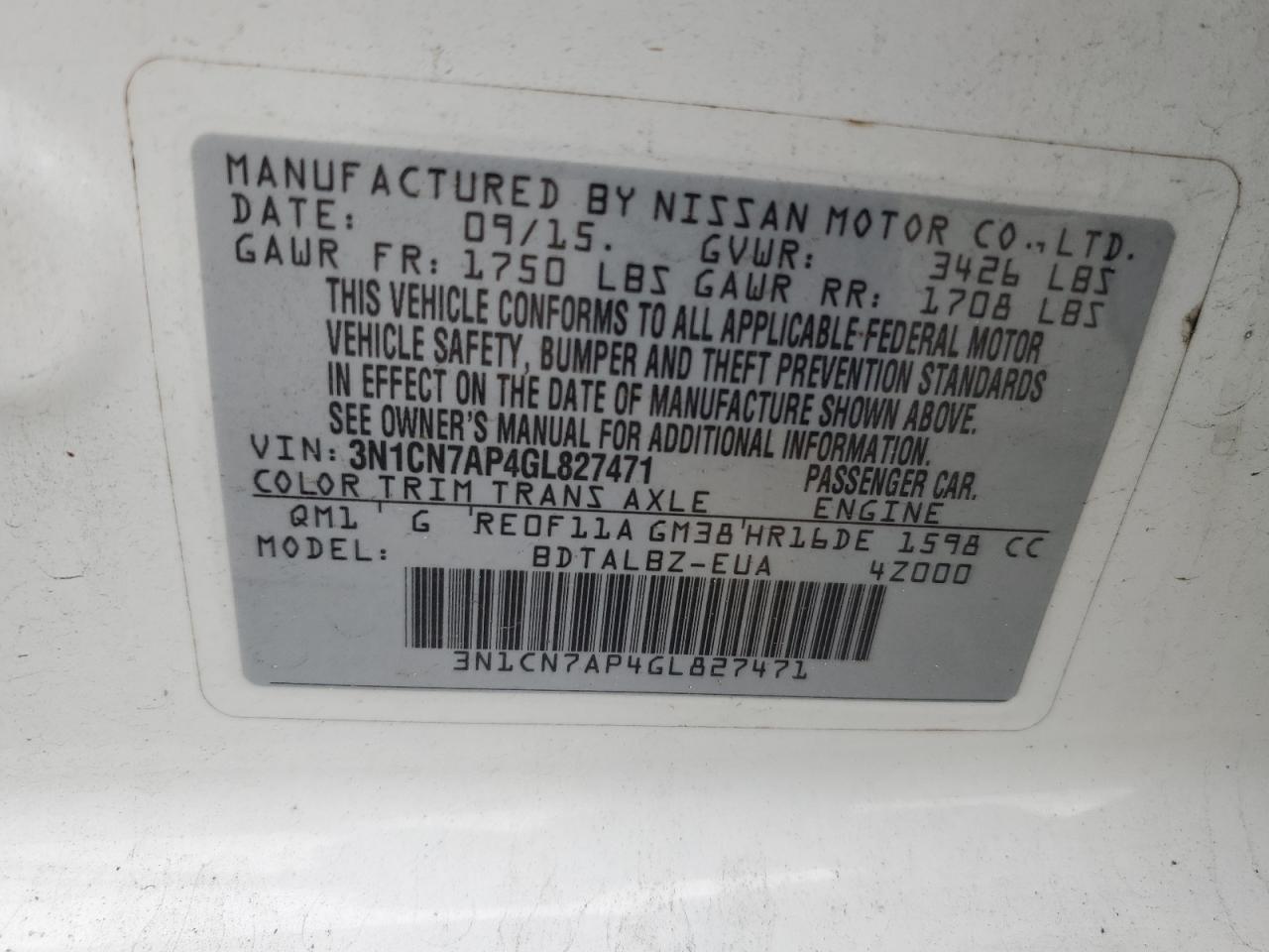 2016 NISSAN VERSA - 3N1CN7AP4GL827471, колір - Білий, 1.6, Бензин, із США