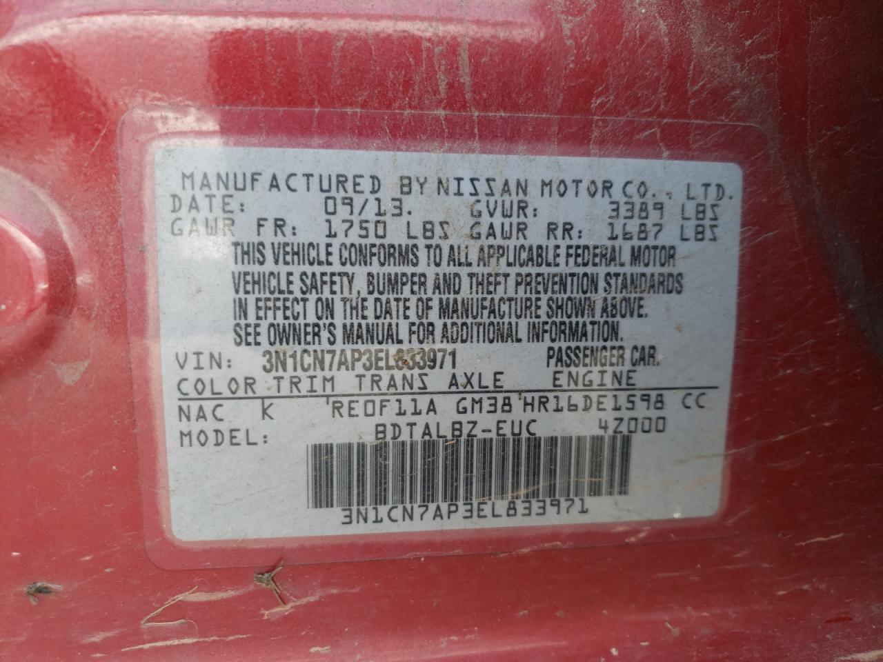 Колір ЧервонийЦиліндри 4VIN 3N1CN7AP3EL833971Стан ЗаводитьсяУшкодження Біо/Хімічні