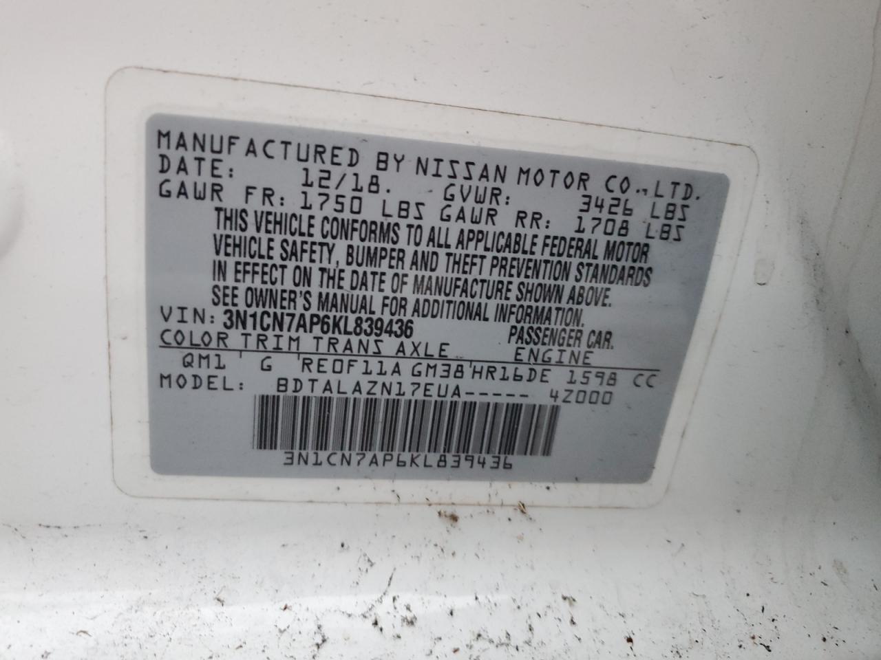 Колір БілийЦиліндри 4VIN 3N1CN7AP6KL839436Стан ЗаводитьсяУшкодження Передня або задняДата аукціона 2025-10-09