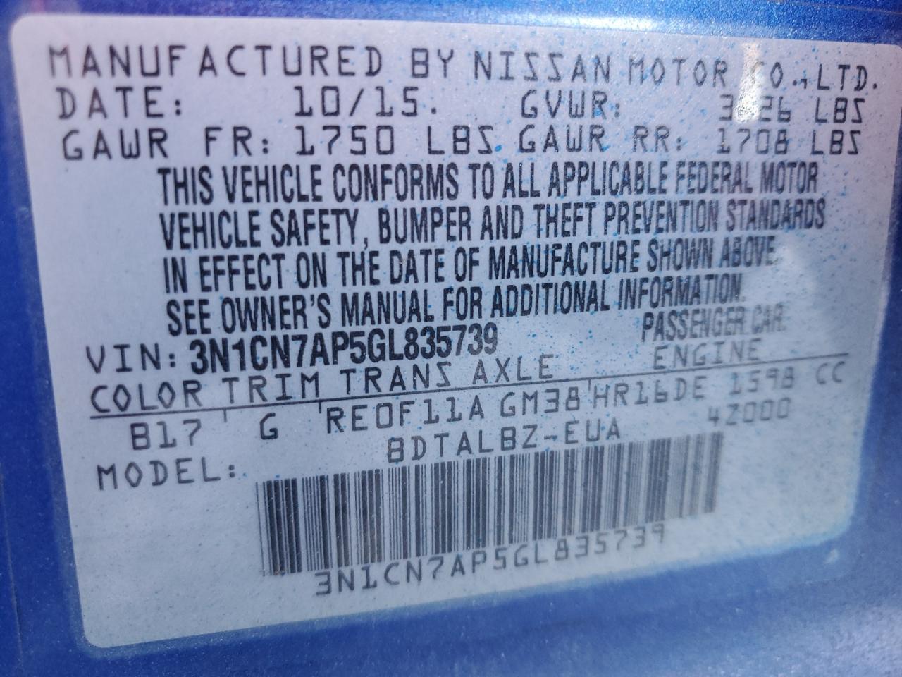2016 NISSAN VERSA - 3N1CN7AP5GL835739, колір - Синій, 1.6, Бензин, із США
