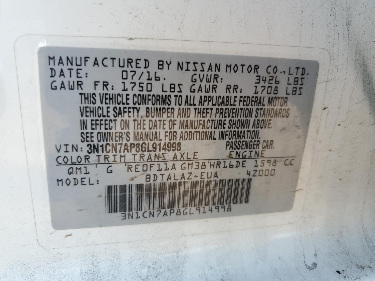 2016 NISSAN VERSA - 3N1CN7AP8GL914998, колір - Білий, 1.6, Бензин, із США