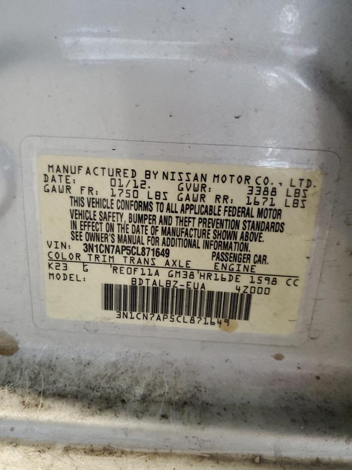 2012 NISSAN VERSA - 3N1CN7AP5CL871649, колір - Срібний, 1.6, Бензин, із США