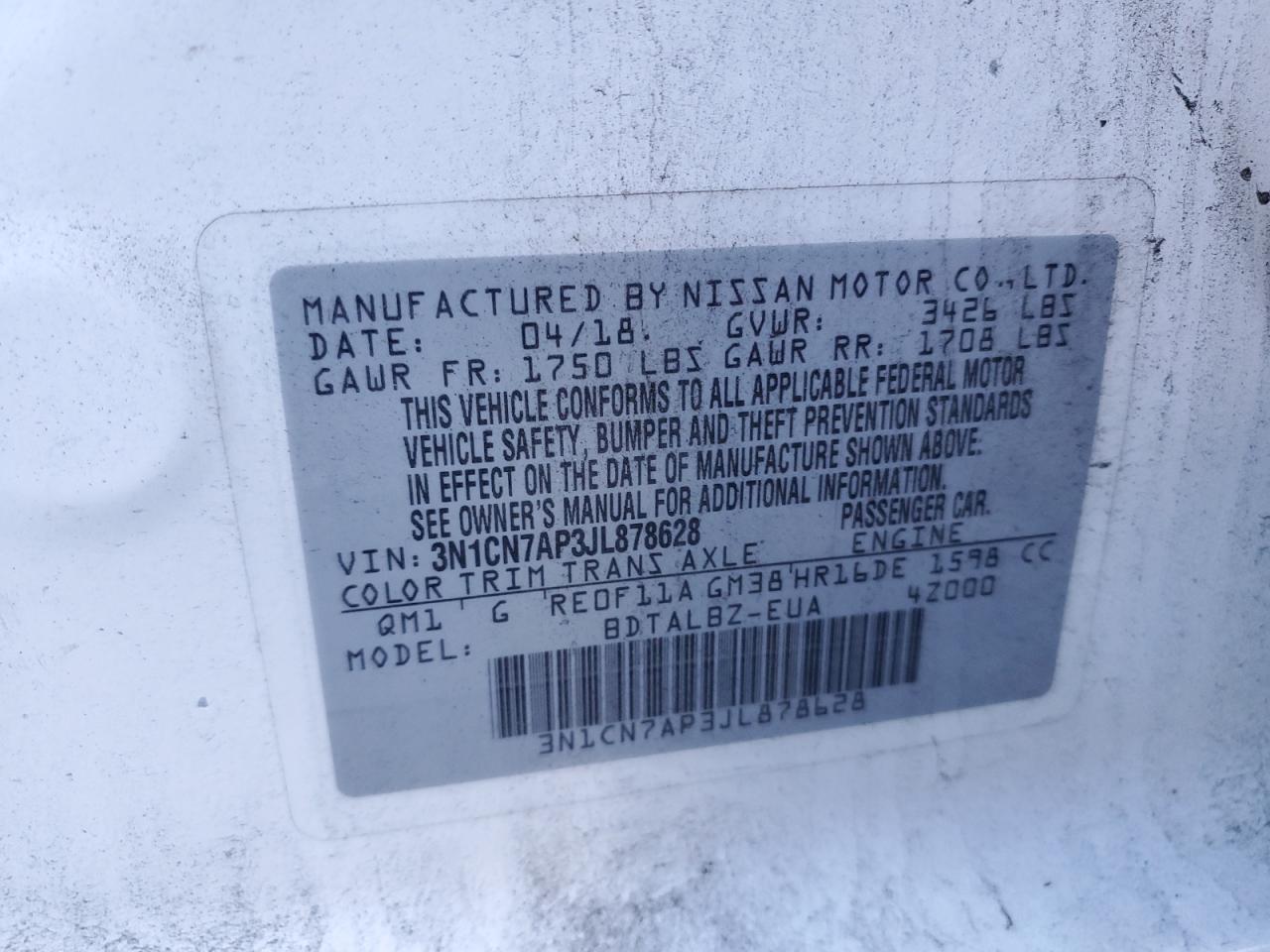 Колір БілийЦиліндри 4VIN 3N1CN7AP3JL878628Стан Заводиться та їде (перевірено)Ушкодження Передня або задня