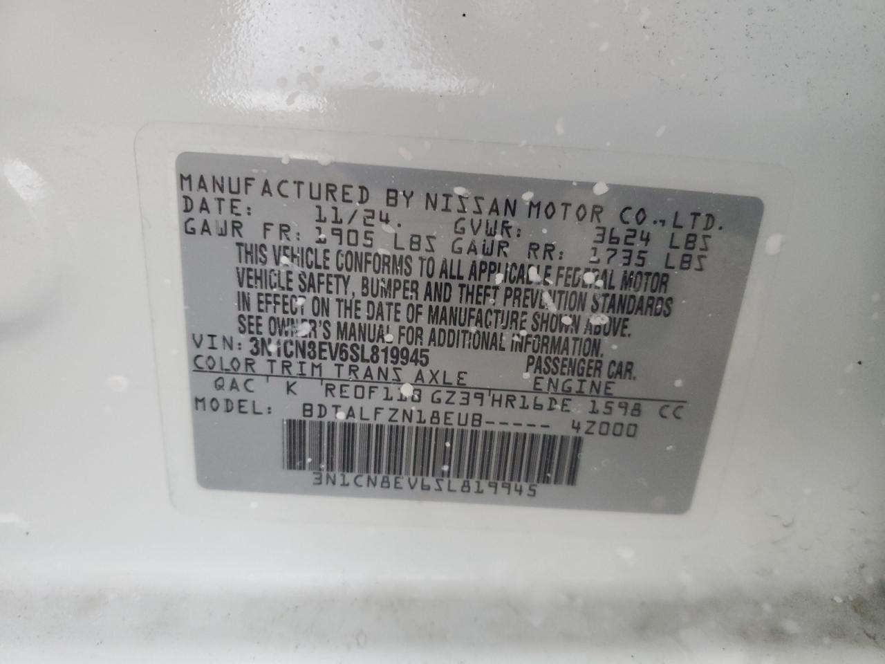 2025 NISSAN VERSA - 3N1CN8EV6SL819945, колір - Білий, 1.6, Бензин, із США