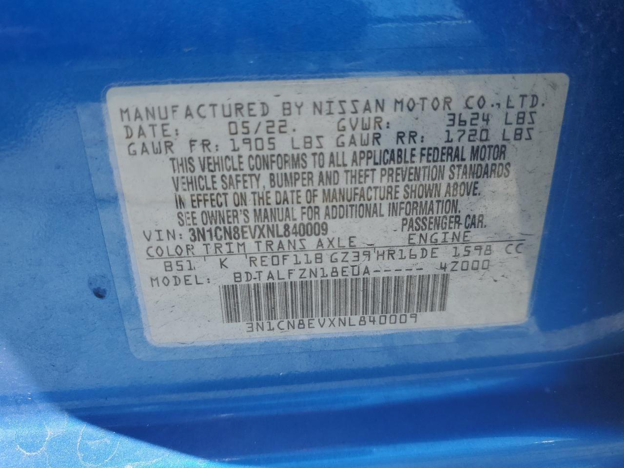 2022 NISSAN VERSA - 3N1CN8EVXNL840009, колір - Синій, 1.6, Бензин, із США
