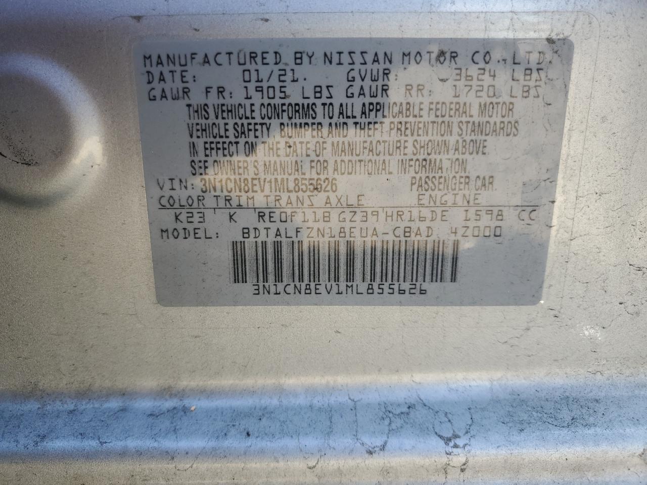 2021 NISSAN VERSA - 3N1CN8EV1ML855626, колір - Срібний, 1.6, Бензин, із США